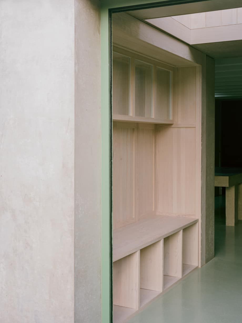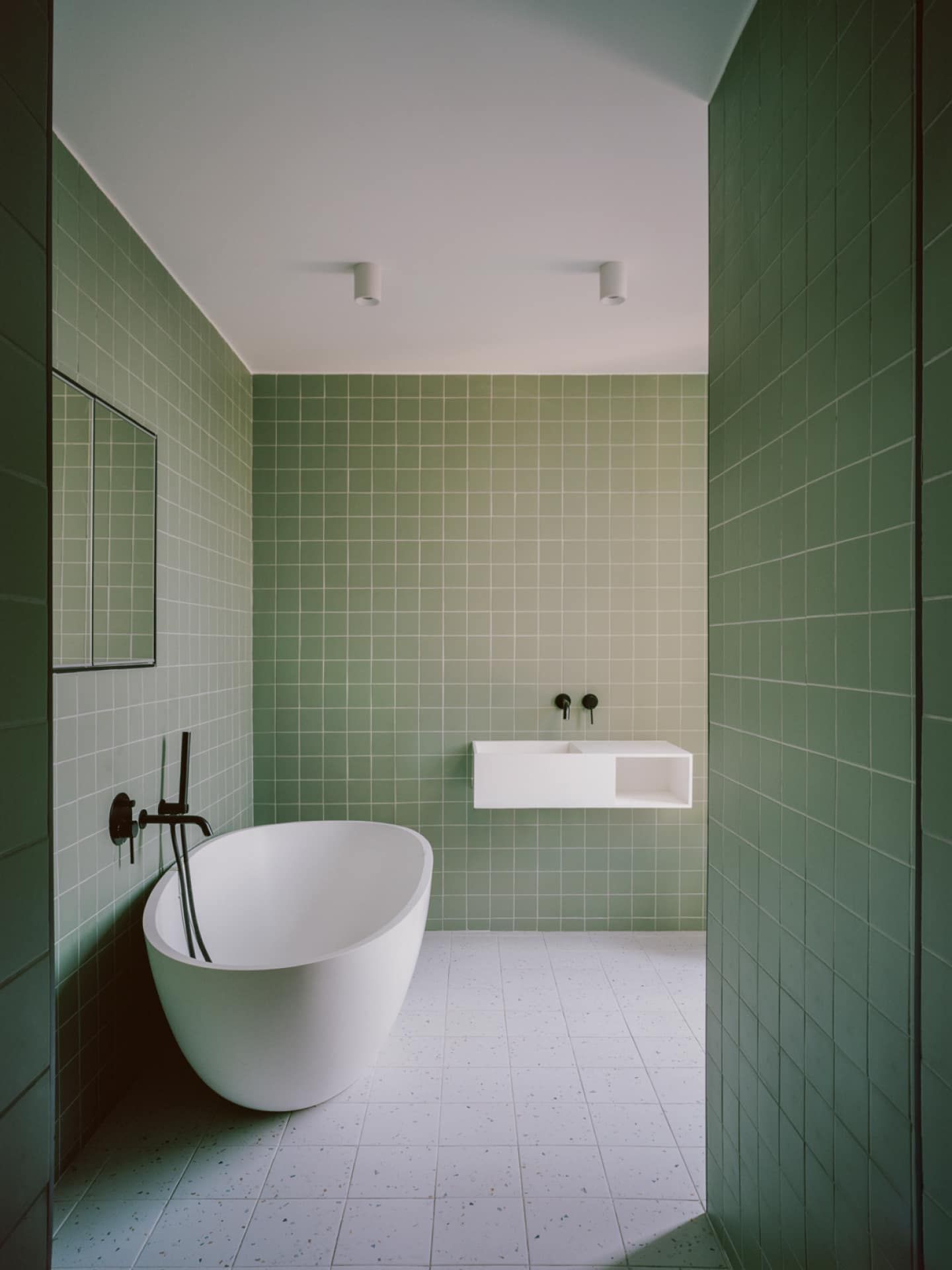 The front and rear elevations are also mirrored. This creates two pockets of space that face the garden – a courtyard on one side, and a study on the other. Generous roof lights allow natural light to pour into the open-plan kitchen and dining room, and colour is introduced through a soft green concrete floor that runs the entire length of the ground floor. Green steel screens carefully layer the windows, and an unexpected steel-clad dormer, housing a new top-floor bathroom, creates an intriguing contrast against the traditional roofline.
