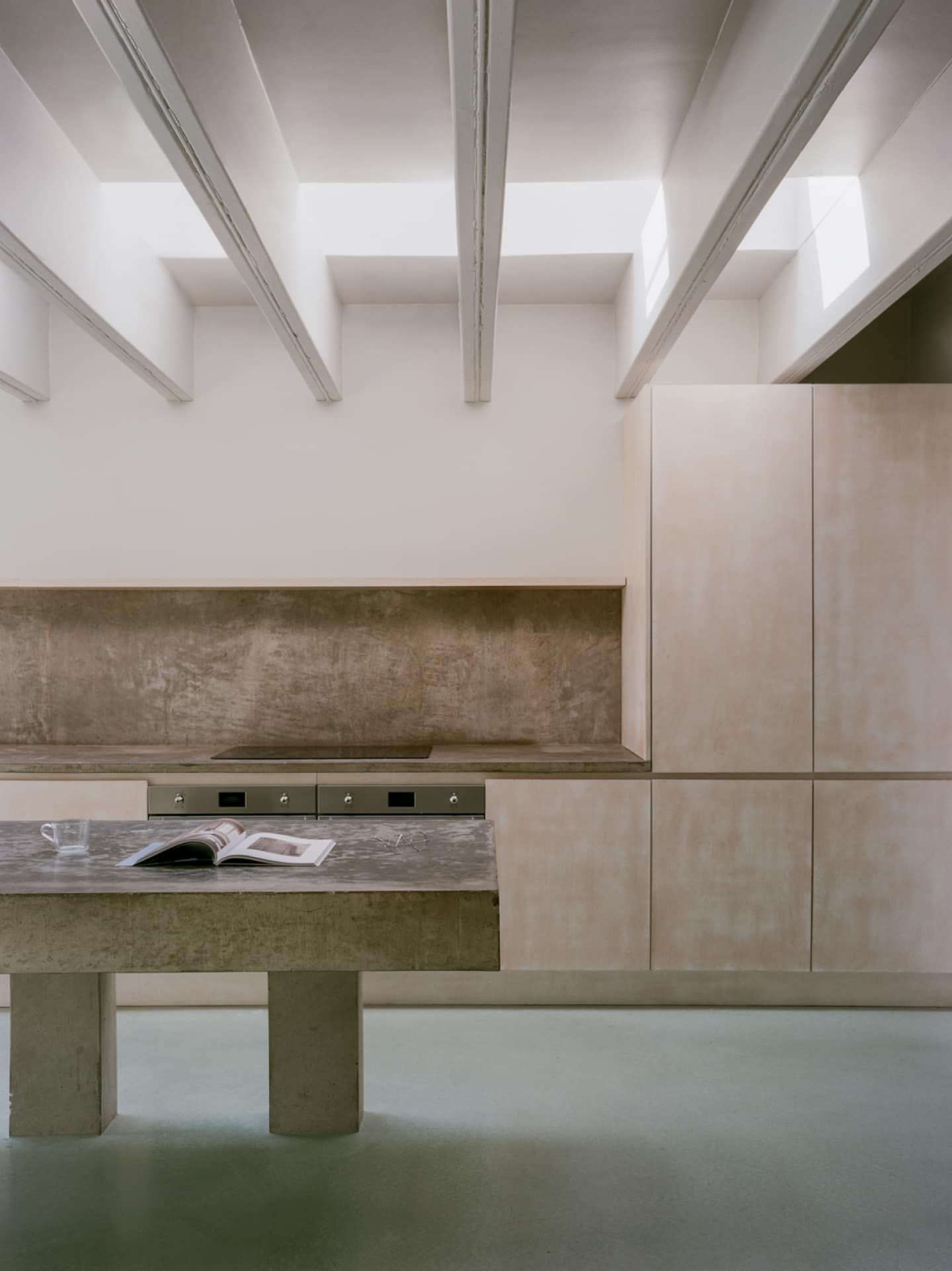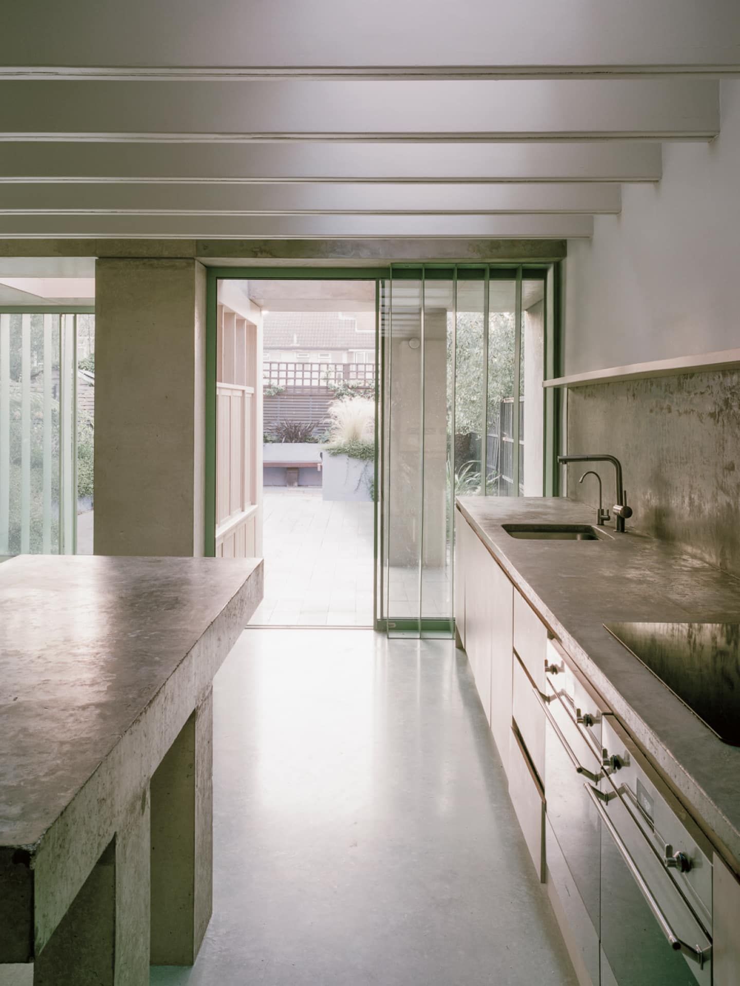 The rear extension consists of a four-column concrete pavilion, supporting the roof slab and the existing home. This structure becomes a recurring motif; inside, the kitchen island takes on this same design, becoming a scaled-down version of the extension. With monolithic, yet airy, proportions, it avoids the bulkiness of a standard kitchen island, letting space flow through below. In each case, a concurrent feeling of something light and something heavy is created.